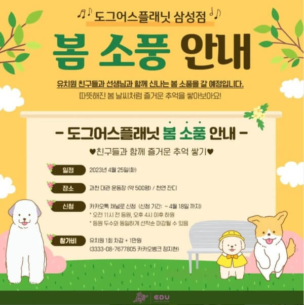 - 견종, 나이, 건강 상태, 성격 등에 따라 분반이 나뉘거나 신청이 거절될 수도 있습니다(예: 전염병, 공격성 등 문제 행동).