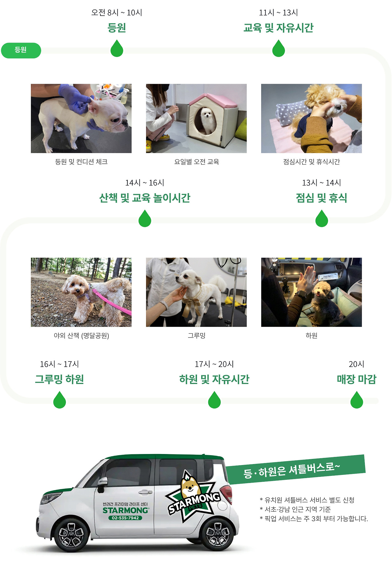 * 아이들은 성향별, 크기별로 분류하여 전문가 선생님이 안전하게 관리합니다. * 첫 등원일로부터 사용기간은 1개월입니다. 1개월이 지난 후 잔여 티켓은 소멸됩니다. * 픽업서비스는 주 3회부터