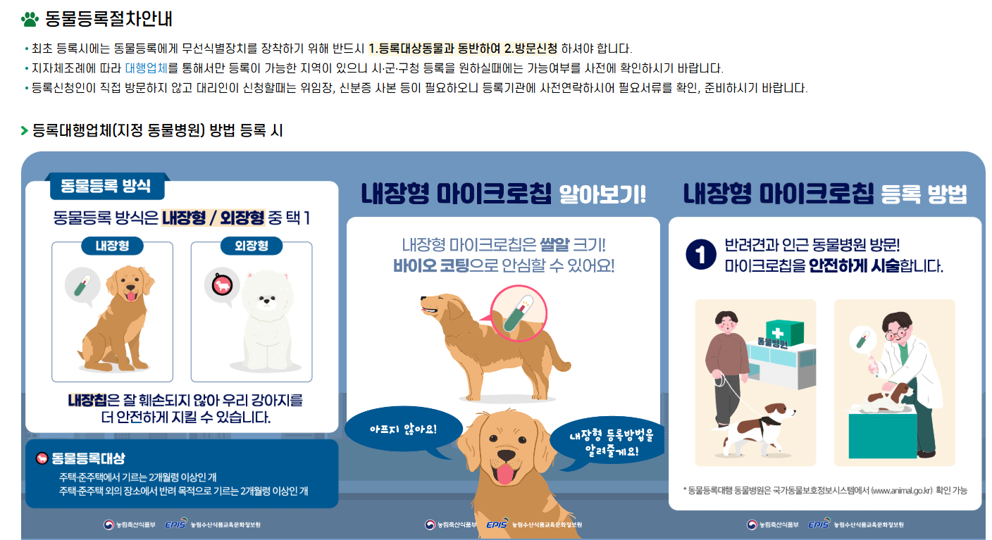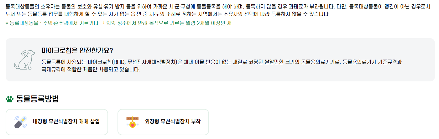 - 등록 방식 선택: 내장형(마이크로칩 삽입) 또는 외장형(인식표 목걸이)